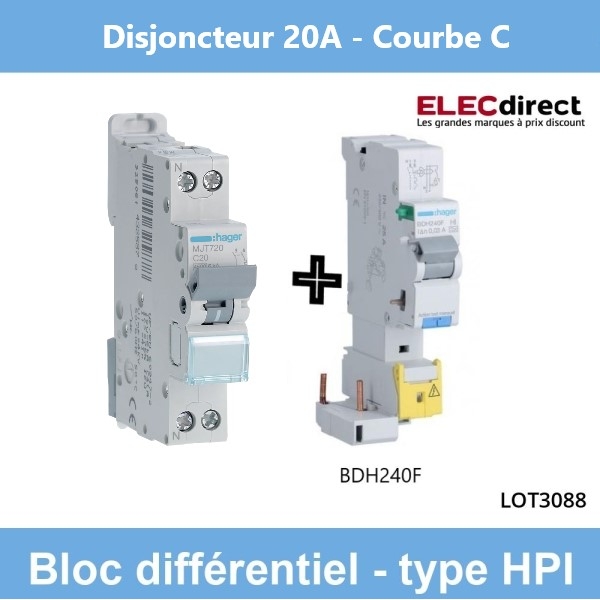 Hager - Disjoncteur 20A courbe C avec Bloc différentiel 40A type HPI - Réf : BDF240F + MJT720