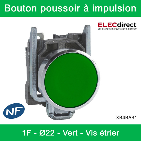 Schneider - Harmony XB4 - Bouton poussoir à impulsion Ø22 - 1F - vert - vis étrier - Réf : XB4BA31