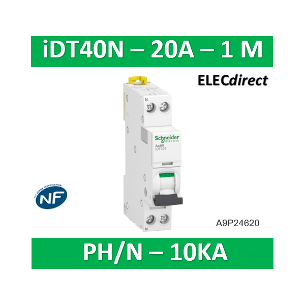 Schneider - Acti9 iDT40N - Disj - 1P+N - 20A - Courbe C - 6000A/10kA - Réf : A9P24620