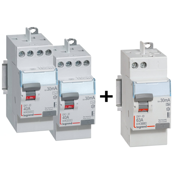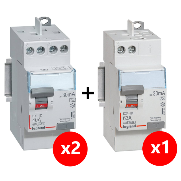 LEGRAND - LOT de 3 inter différentiels DX3 - (2 - ID 2x40A 30mA AC - ID 2x63A 30mA A) 411611x2 + 411651