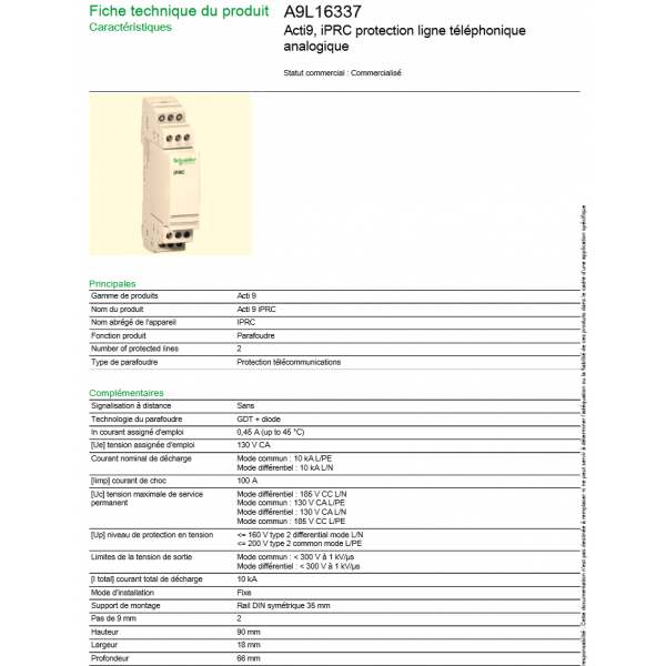 Schneider - Parafoudre bipolaire RESI9 NF PH+N 10KA + parafoudre ligne téléphonique - R9PLC+A9L16337