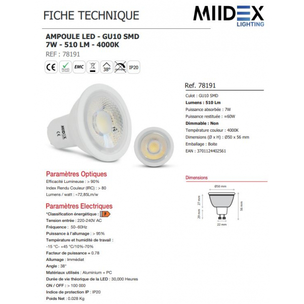 Vision EL - Lampe LED 7W - non Dimmable - 4000K - 510 lumens - GU10 230V - 78191