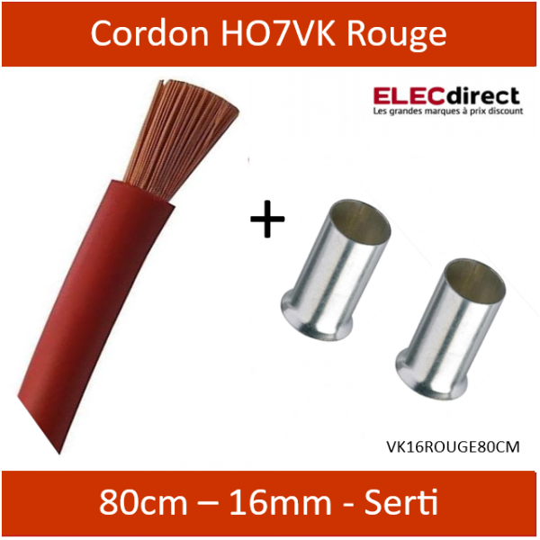 Cordon de 0.80M de 16mm² souple Rouge + Embout - Réf : VK16ROUGE80CM